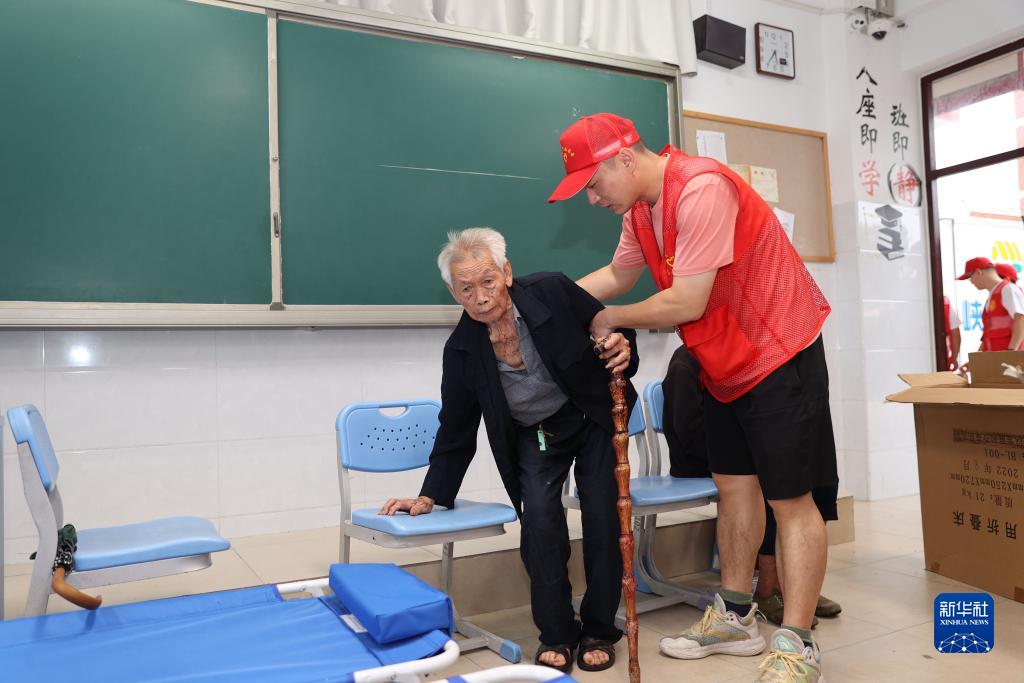 7月29日,在福建省廈門市新圩學校臨時安置點,志願者攙扶一名行動不便的老人。