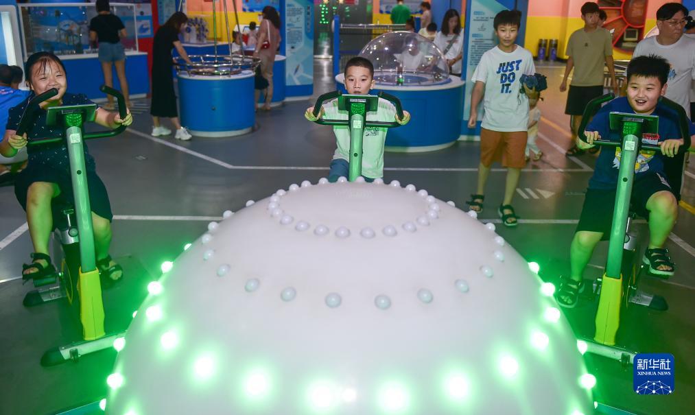 7月29日,小朋友在河南省洛陽市科技館參觀體驗“人力發電”科普設備。