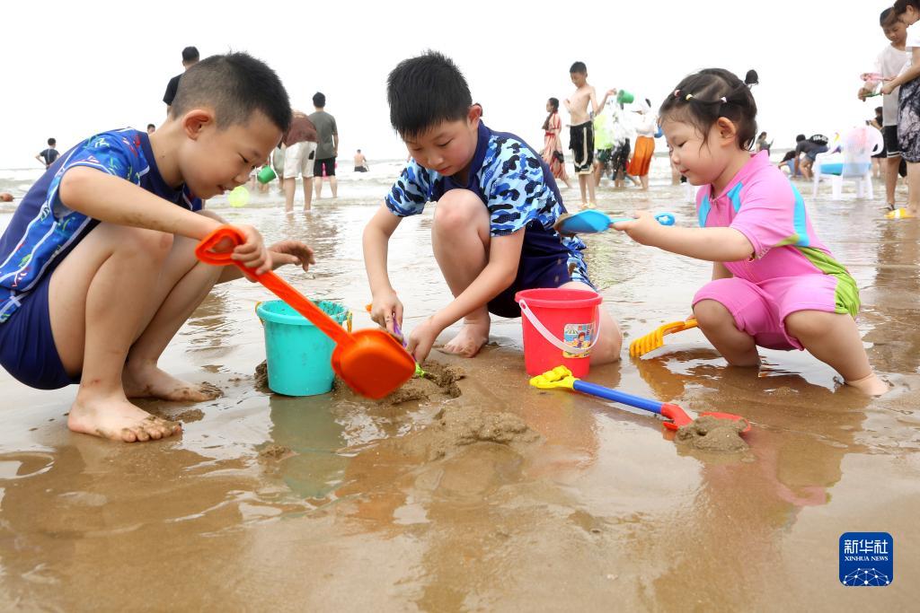 7月29日,小朋友們在江蘇省連雲港市連島景區大沙灣海濱浴場沙灘上玩沙子。