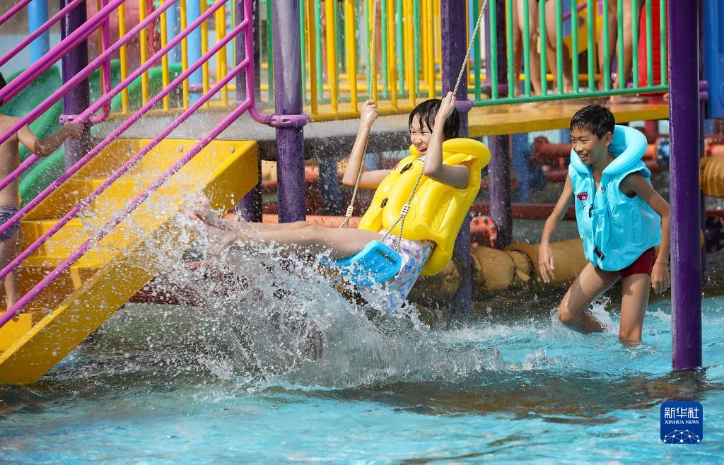 7月29日,孩子們在貴州省黔東南苗族侗族自治州丹寨縣揚武鎮鄉村水上樂園玩水。