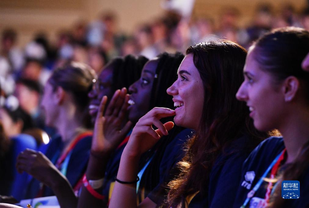 7月29日,外國運動員在聯歡會現場觀看節目。新華社記者 張端 攝