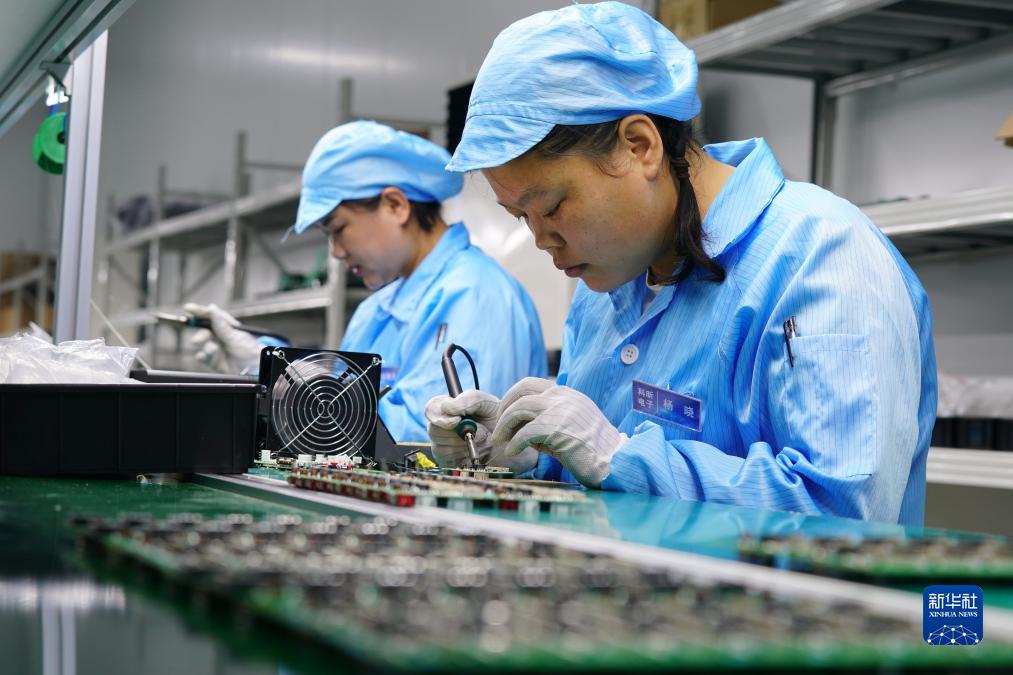 7月29日,河北省平鄉縣一家童車生産企業的員工在組裝電動童車控制器。