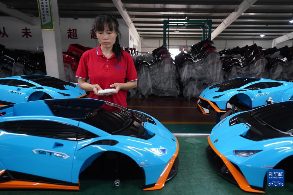 7月29日,河北省平鄉縣一家童車生産企業的員工在測試電動童車。