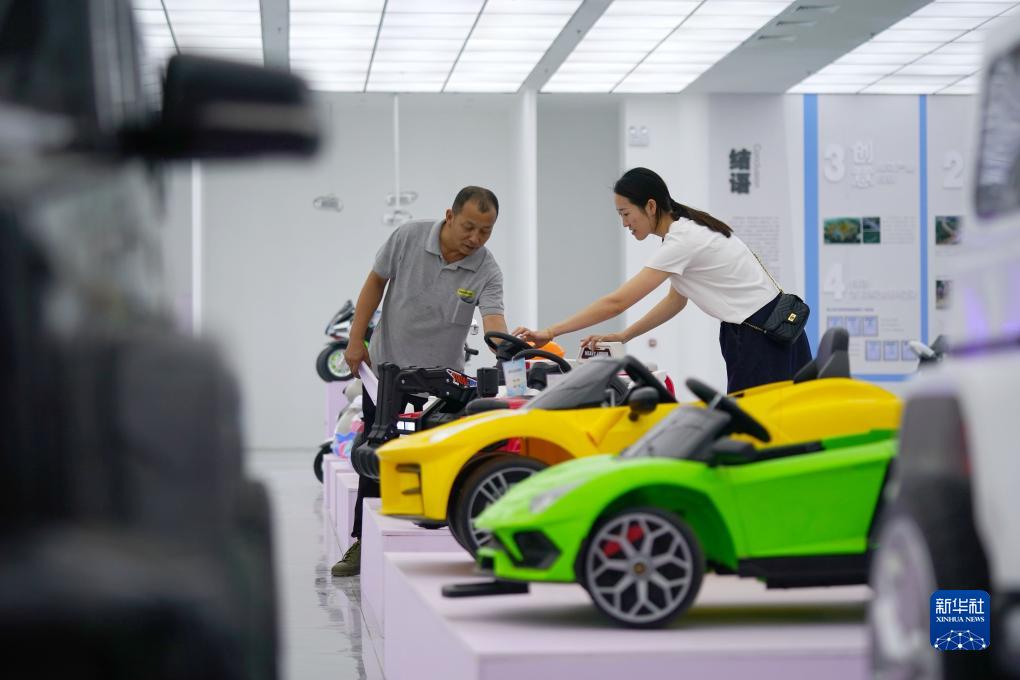7月29日,客戶在河北省平鄉縣一家童車生産企業的展廳內挑選電動童車。