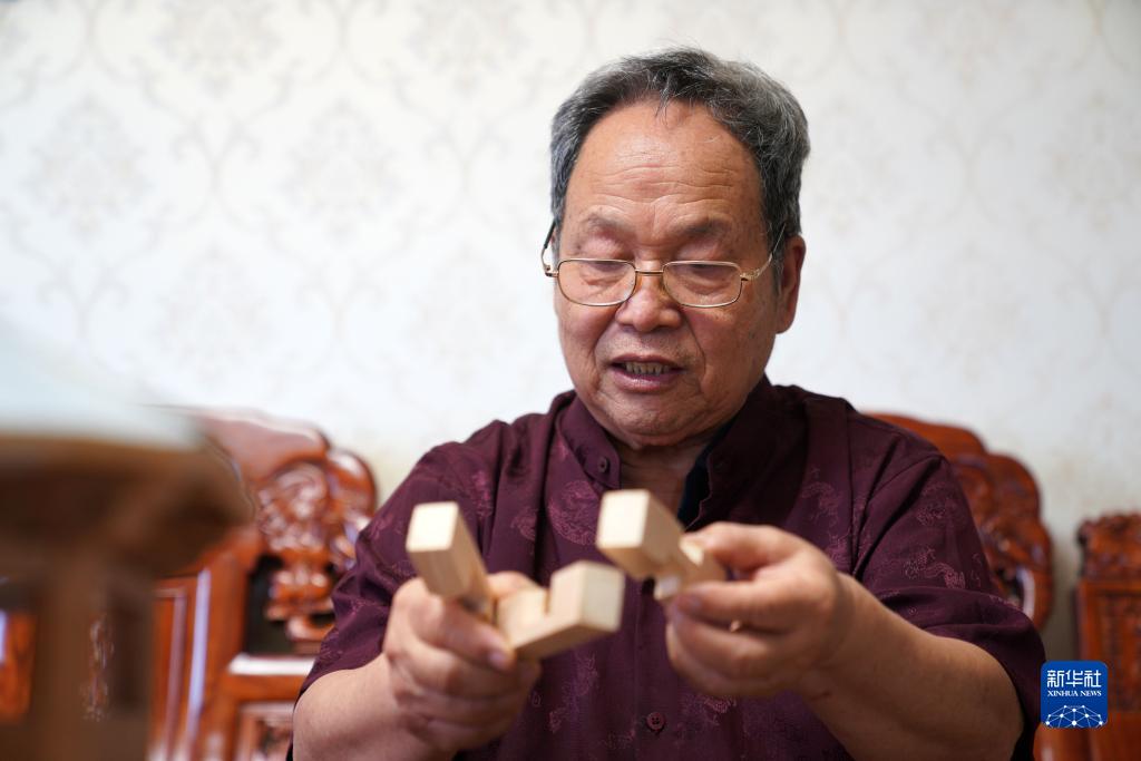 7月30日,侯全辰在家中演示拼接孔明鎖。