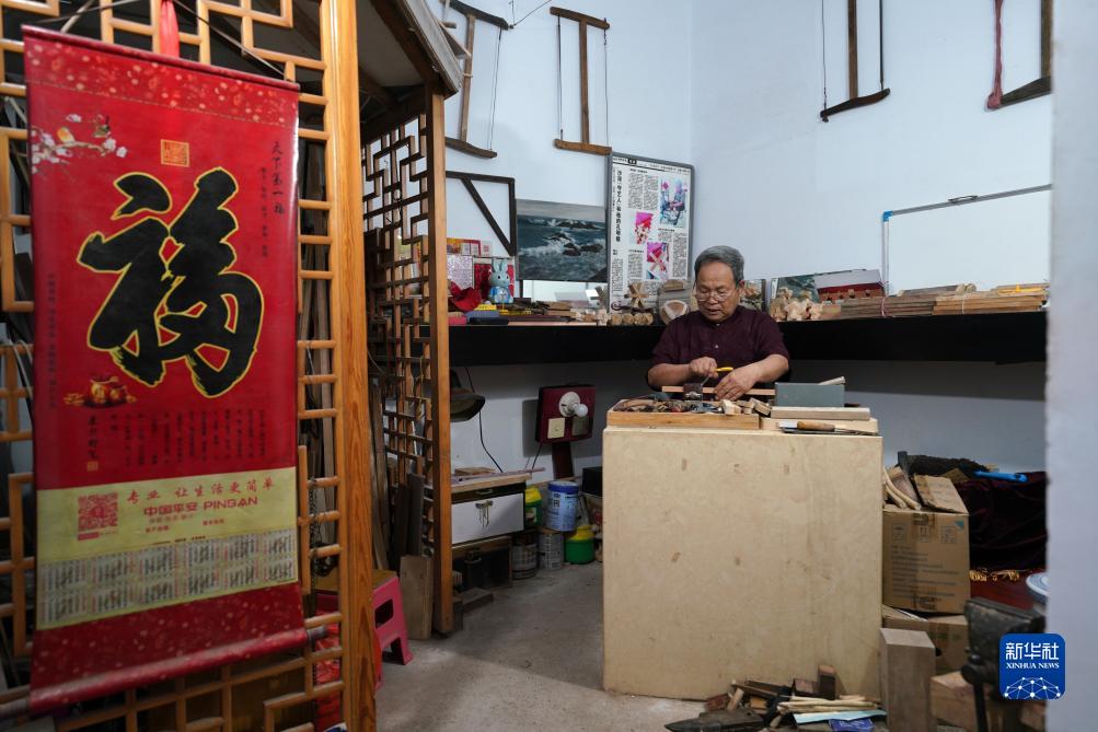 7月30日,侯全辰在工作間內製作孔明鎖。