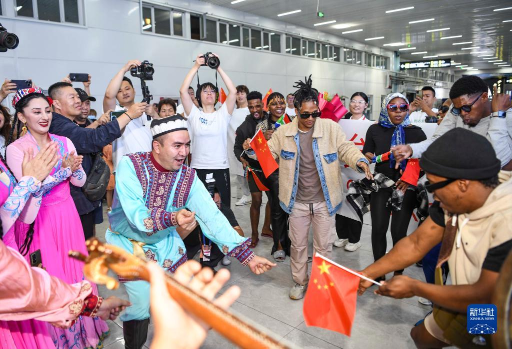 新疆藝術劇院木卡姆藝術團的演員在烏魯木齊地窩堡國際機場盛情起舞,歡迎抵達的南非舞蹈演員(7月24日攝)。