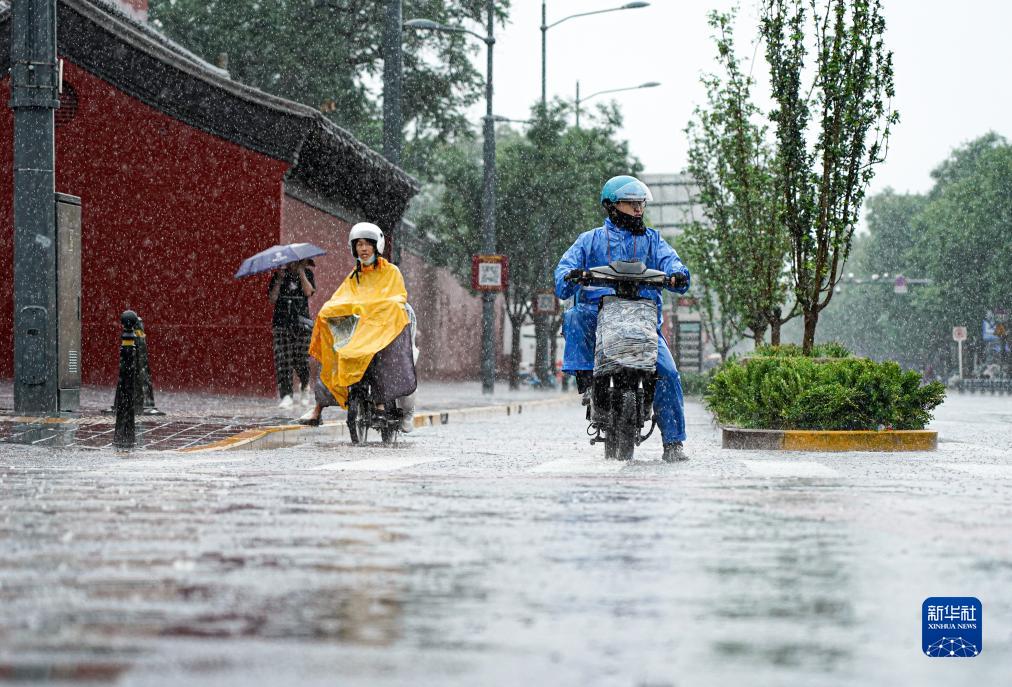 7月30日,人們在北京雍和宮大街冒雨騎行。