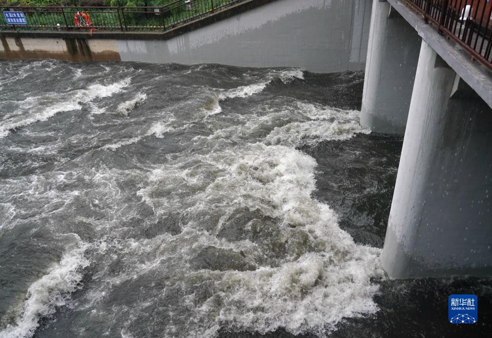 這是7月30日拍攝的涼水河分洪道閘。7月29日起,北京將南護城河洪水通過分洪道閘向涼水河分洪,減輕城區防洪壓力。