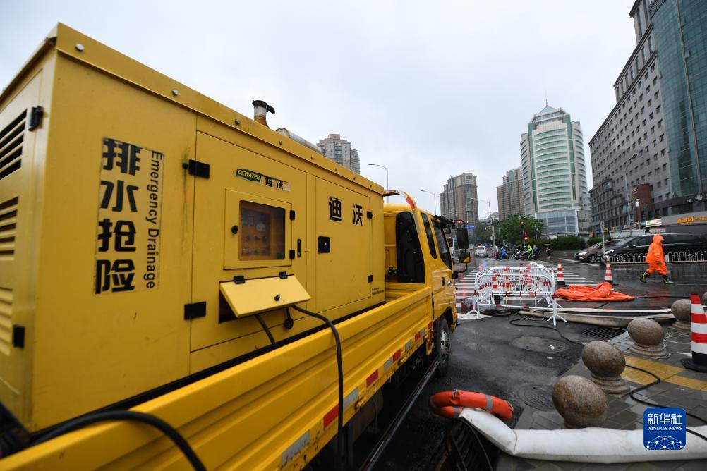 7月30日,在北京市朝陽區十里河橋附近,北京排水集團的工作車輛在現場值守。
