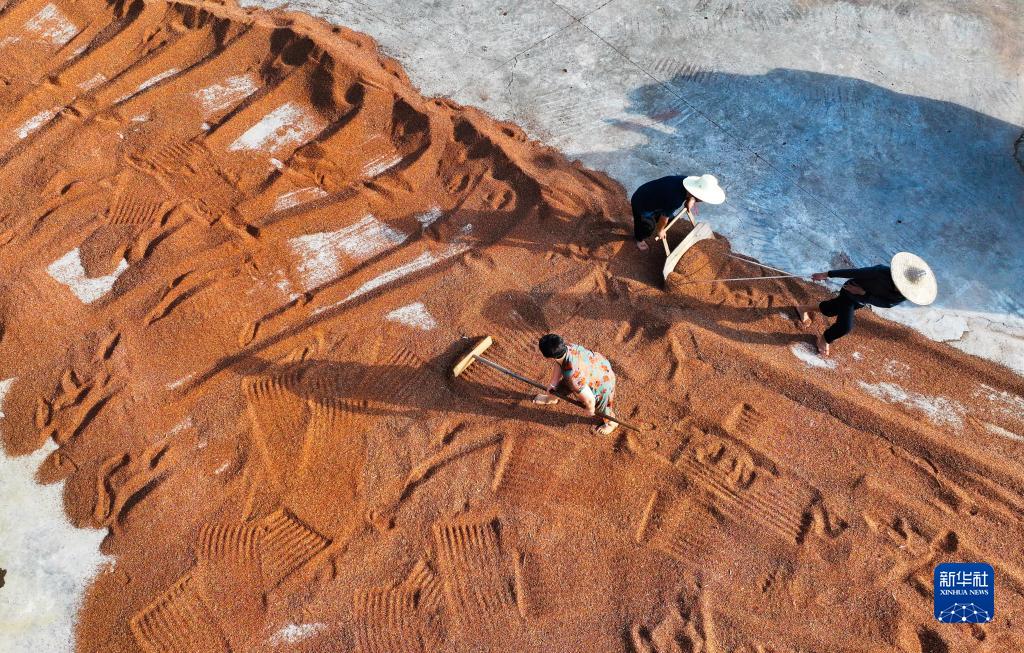 7月30日,四川省瀘州市江陽區黃艤鎮永興村村民在晾曬高粱(無人機照片)。