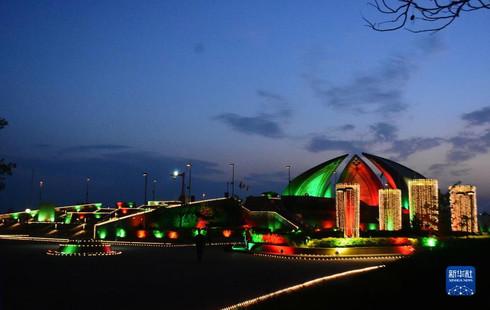 近日,巴基斯坦首都伊斯蘭堡地標建築亮起中巴兩國國旗顏色燈光,慶祝中巴經濟走廊啟動十周年。