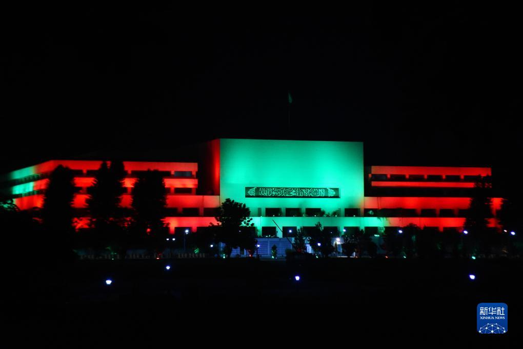 近日,巴基斯坦首都伊斯蘭堡地標建築亮起中巴兩國國旗顏色燈光,慶祝中巴經濟走廊啟動十周年。
