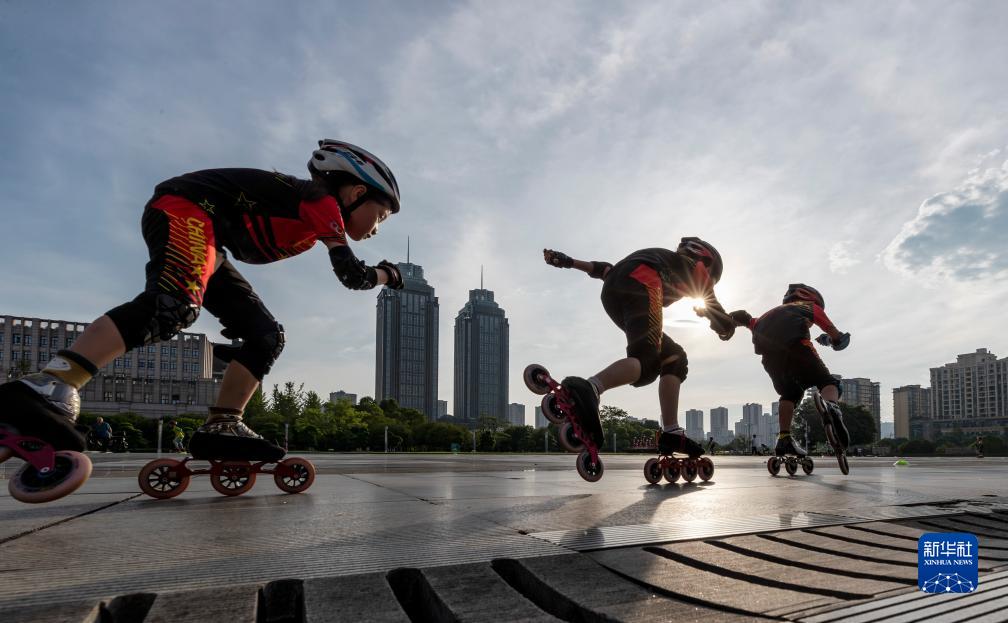 7月30日,孩子們在重慶市南川區市民廣場迎着朝陽練習輪滑。