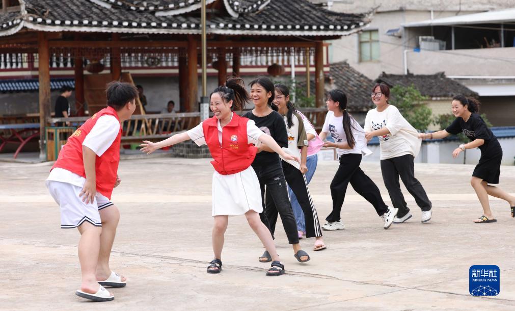 7月30日,大學生志願者在貴州省黔東南苗族侗族自治州岑鞏縣水尾鎮馬家寨村和學生做游戲。暑期,來自貴州師範大學、天津師範大學、寧夏大學等10所大學的學生組成聯合支教志願者隊伍,深入貴州省黔東南苗族侗族自治州岑鞏縣多個行政村,幫助暑期回家的學生開展體育活動,解決學習中遇到的難題,為他們的暑期生活增色添彩。