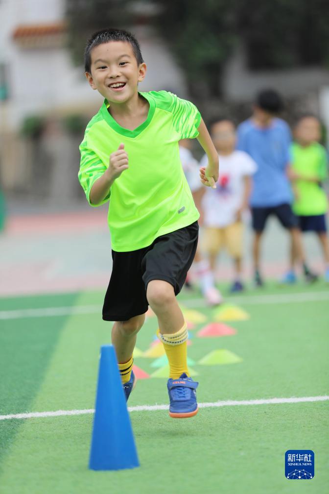 7月30日,在湖南省永州市道縣樹湘學校足球場,小朋友進行身體靈敏度訓練。