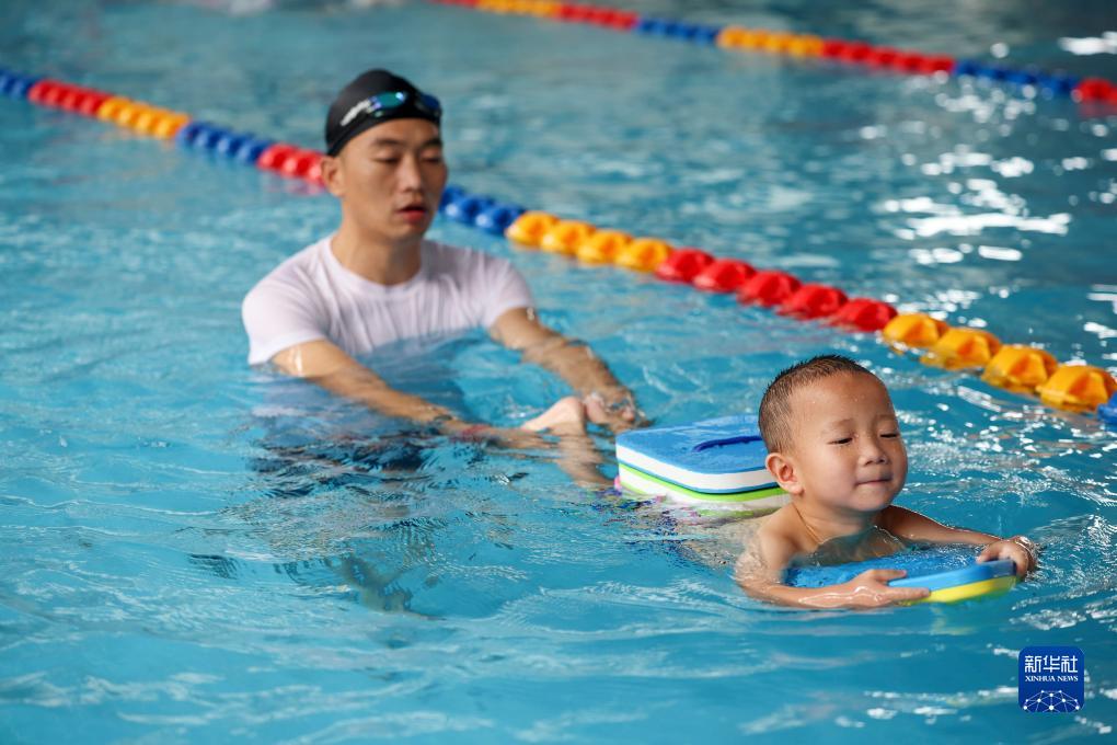 7月30日,在貴州省黔東南苗族侗族自治州丹寨縣一家游泳館,教練指導小學員學習正確的游泳姿勢。