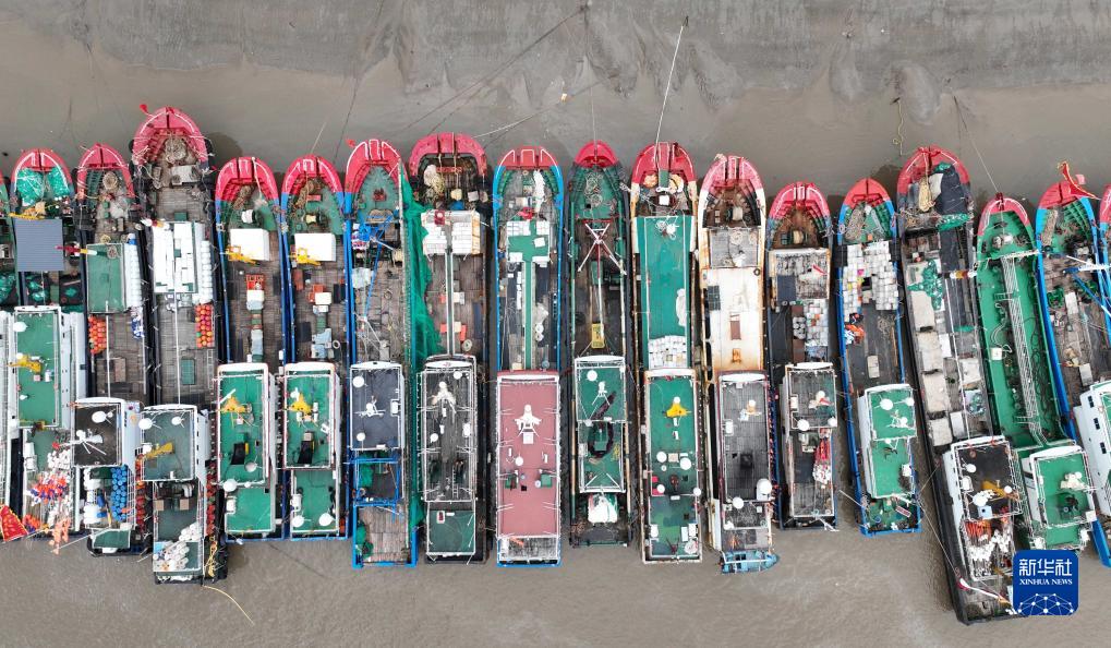 7月30日,漁船停靠在浙江省舟山市普陀區沈家門漁港(無人機照片)。