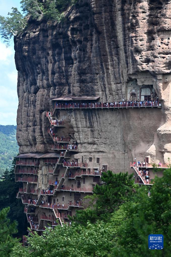 進入暑期,地處甘肅省天水市麥積區的麥積山石窟迎來旅游高峰。為保障游客與文物安全,麥積山石窟藝術研究所優化參觀路線,從7月29日起至8月25日間開啟路線陡峭的應急1號線和路線平緩的應急2號線兩條參觀線路供游客選擇,以此提升游客體驗。麥積山石窟是“中國四大石窟”之一,因其形似麥垛而得名,也是世界文化遺産“絲綢之路:長安-天山廊道的路網”的遺産點之一。