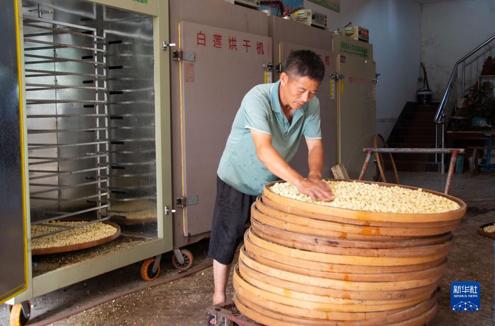 7月31日,在湖南省湘潭縣花石鎮羅漢村一湘蓮加工基地,當地村民準備將湘蓮放入烘乾機。