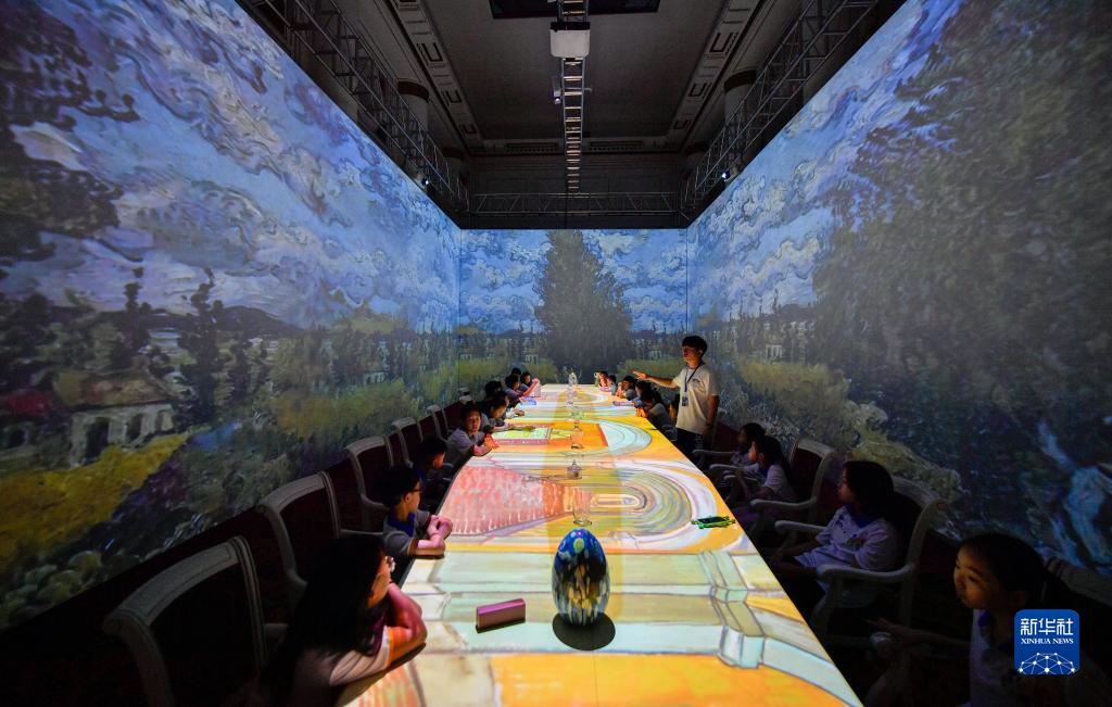7月30日,在天津數字藝術博物館,學生們沉浸式參觀油畫藝術作品。
