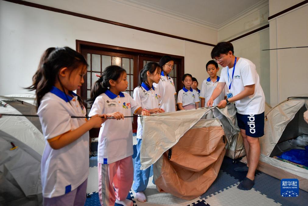 7月30日,在天津數字藝術博物館,學生們在指導老師的幫助下學習搭建帳篷。