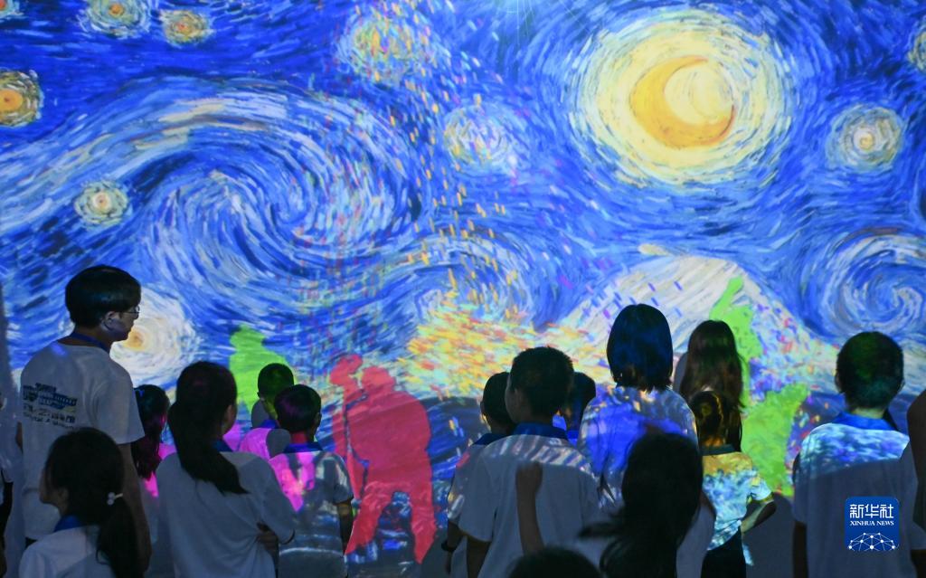 7月30日,在天津數字藝術博物館,學生們沉浸式參觀藝術作品。