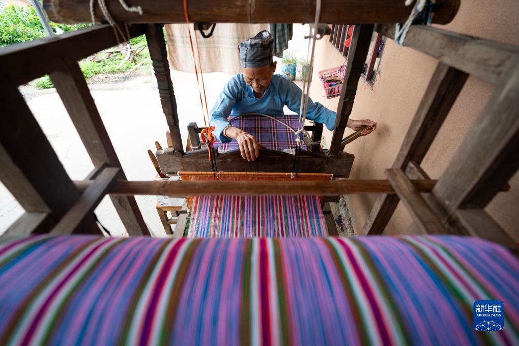7月30日,一名坡芽村壯族村民在使用織布機織壯錦。