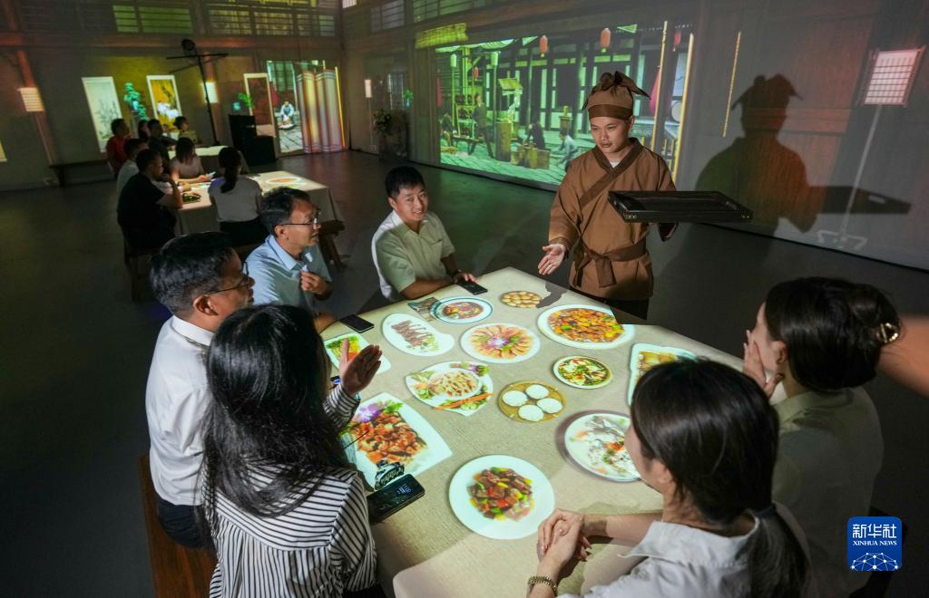 7月31日,游客在《畫游清明上河──故宮沉浸藝術展》孫羊店全沉浸光影空間內體驗宋朝時期餐館的生活。