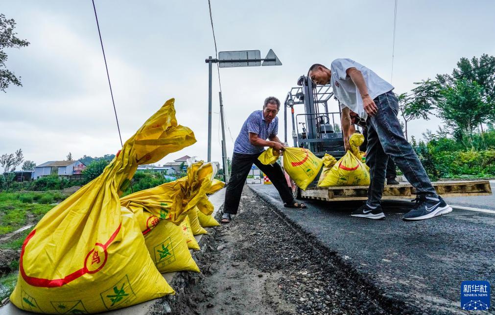7月31日,河北省遵化市羅文峪村農民在河道旁堆放防洪沙袋。