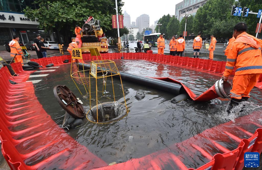 7月31日,在河北省石家莊市裕華路一處積水路段,工作人員進行緊急排水。