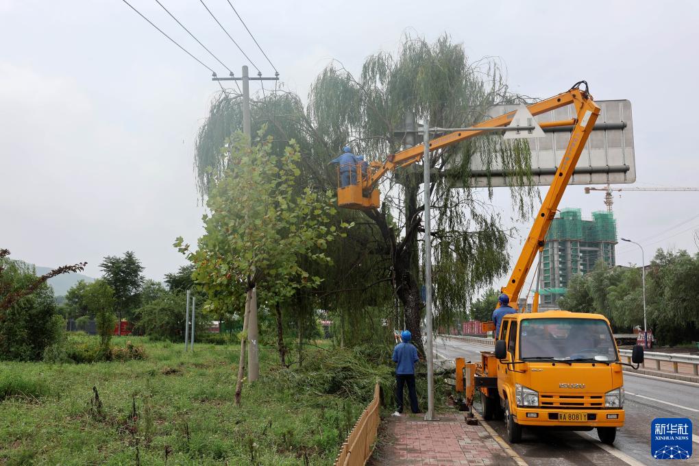7月31日,在河北省石家莊市井陘縣307國道長崗村段,供電部門工作人員對損毀線路進行搶修。