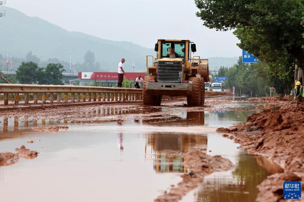 7月31日,在河北省井陘縣307國道長崗村段,防汛工作人員駕駛機械清理淤泥。