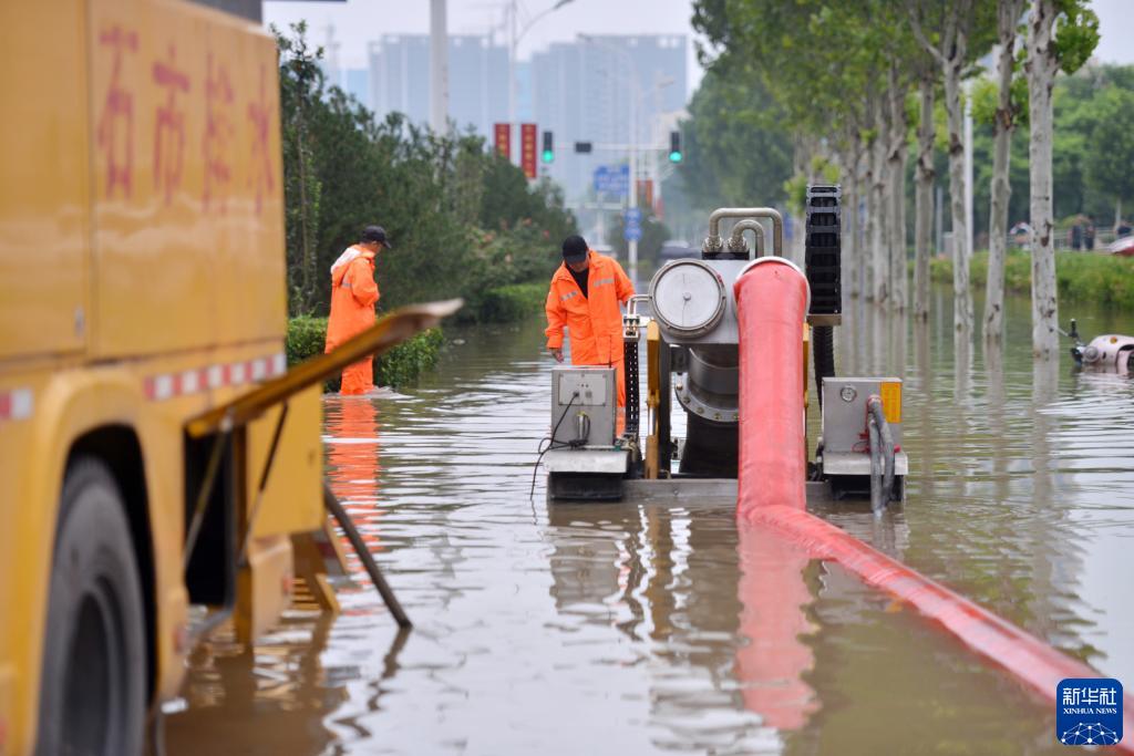 7月31日,在河北省石家莊市天山北大街一積水路段,工作人員進行緊急排水。