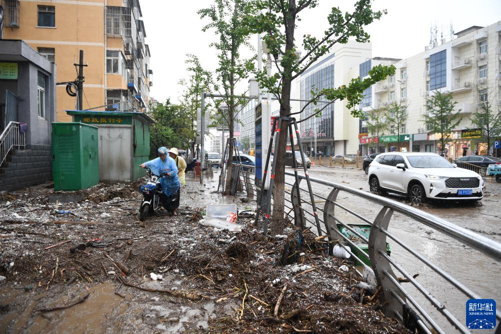 7月31日,在北京市門頭溝區雙峪路,行人從淤泥和雜物上走過。