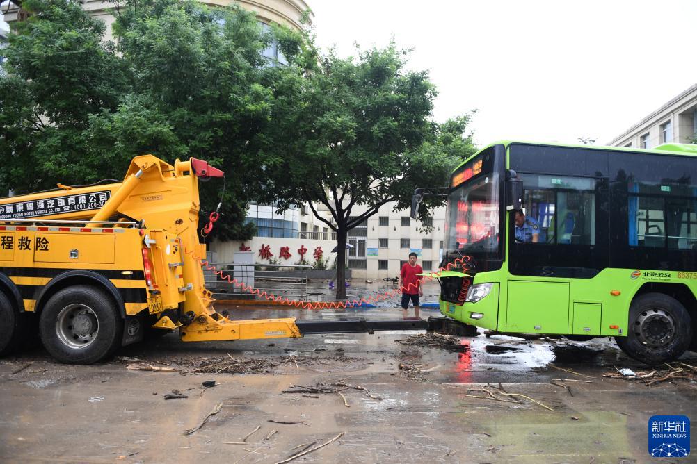7月31日,搶險人員在北京市門頭溝區新橋大街救援拋錨的公交車。