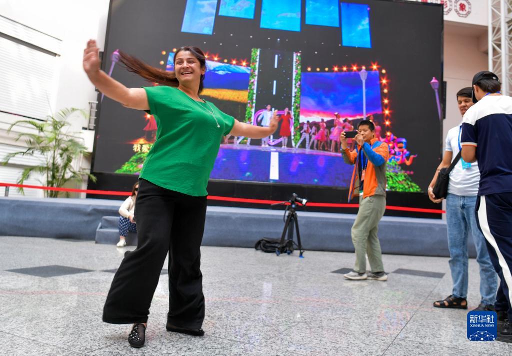 7月31日,在新疆藝術劇院,塔吉克斯坦羅拉國家功勳歌舞團演職人員在交流活動現場隨音樂起舞。