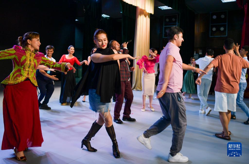7月31日,在新疆藝術劇院,塔吉克斯坦羅拉國家功勳歌舞團與新疆藝術劇院的演員一起載歌載舞。