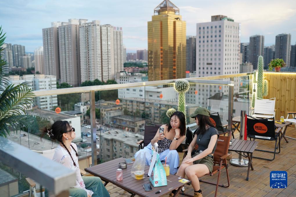 7月26日,年輕人在一棟由停車樓頂層改造而來的飲品店內消費休閒。