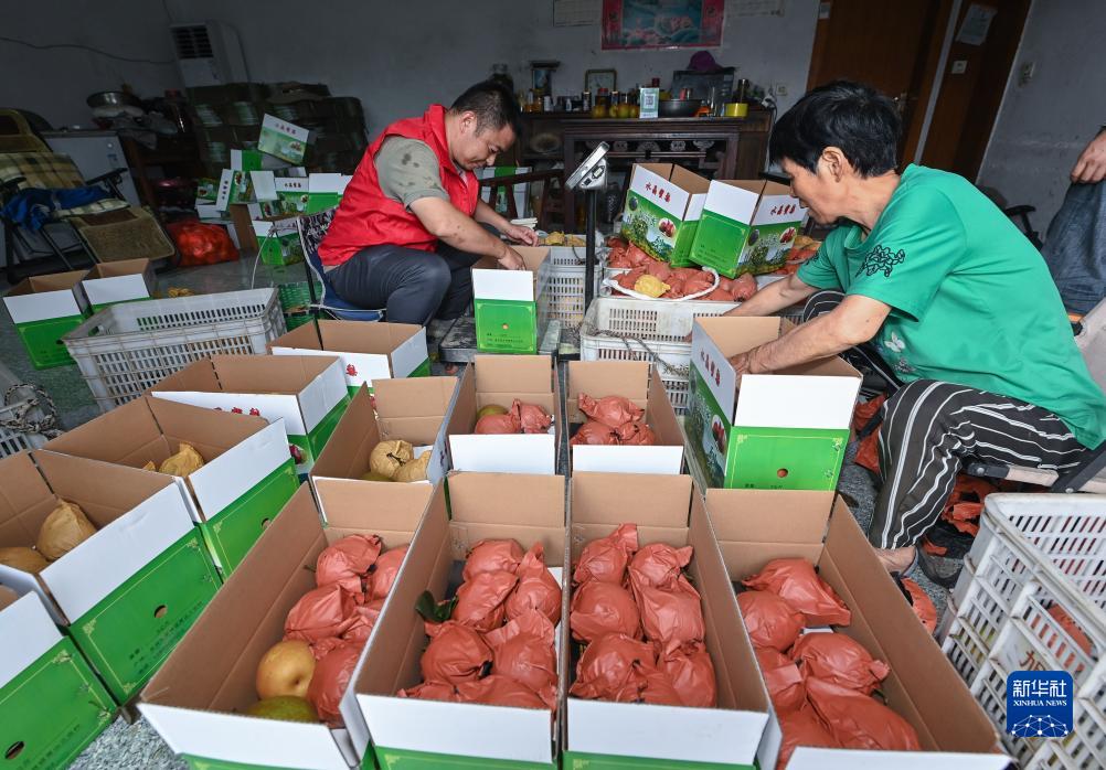 8月1日,黨員志願者在湖州市東林鎮三合村的蜜梨種植基地幫助種植戶打包蜜梨。