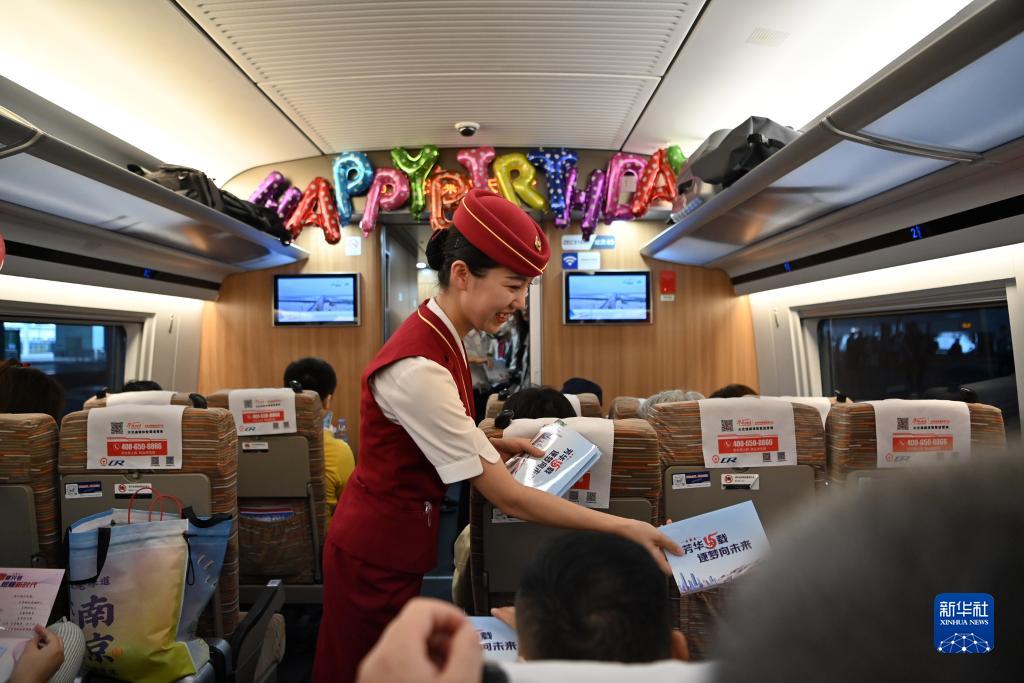 8月1日,天津客運段的乘務人員在京津城際列車上給旅客發放紀念冊。