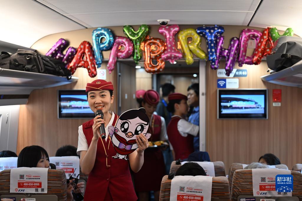 8月1日,天津客運段的乘務人員在京津城際列車上給旅客介紹文創産品“喜十五”。
