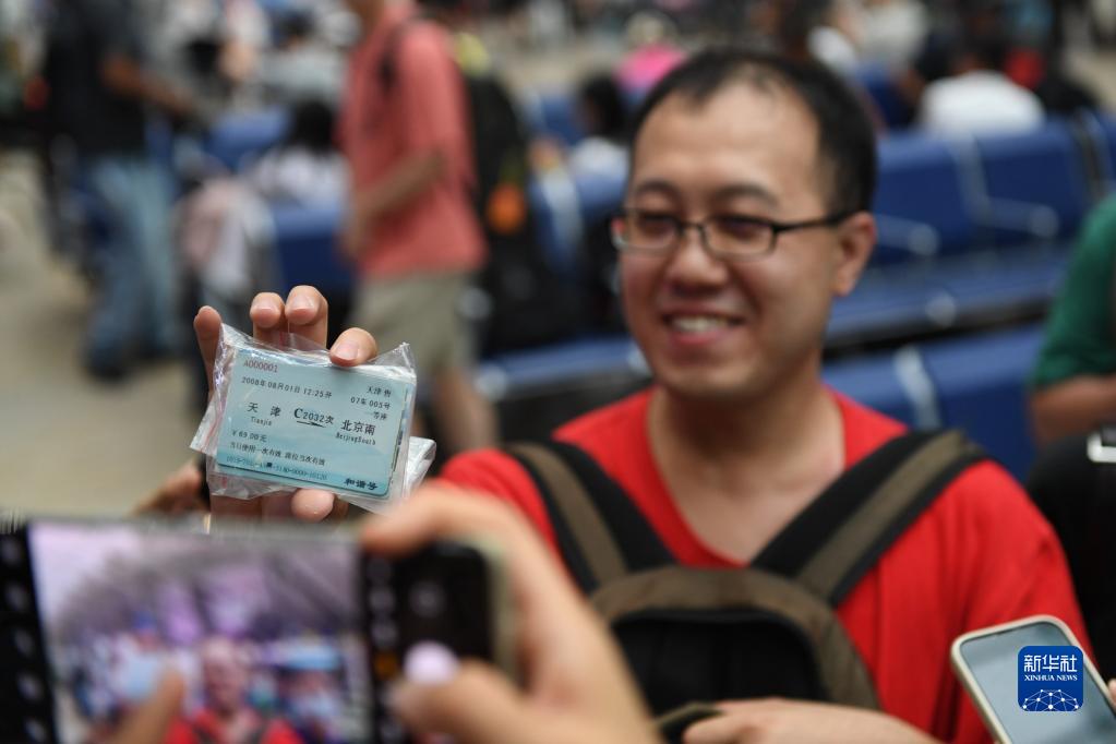 8月1日,一名旅客向記者展示2008年8月1日京津城際鐵路開通運營時所購買的火車票。