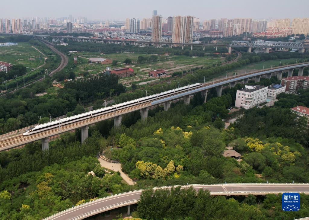 京津城際列車從天津城區穿行(7月20日攝,無人機照片)。