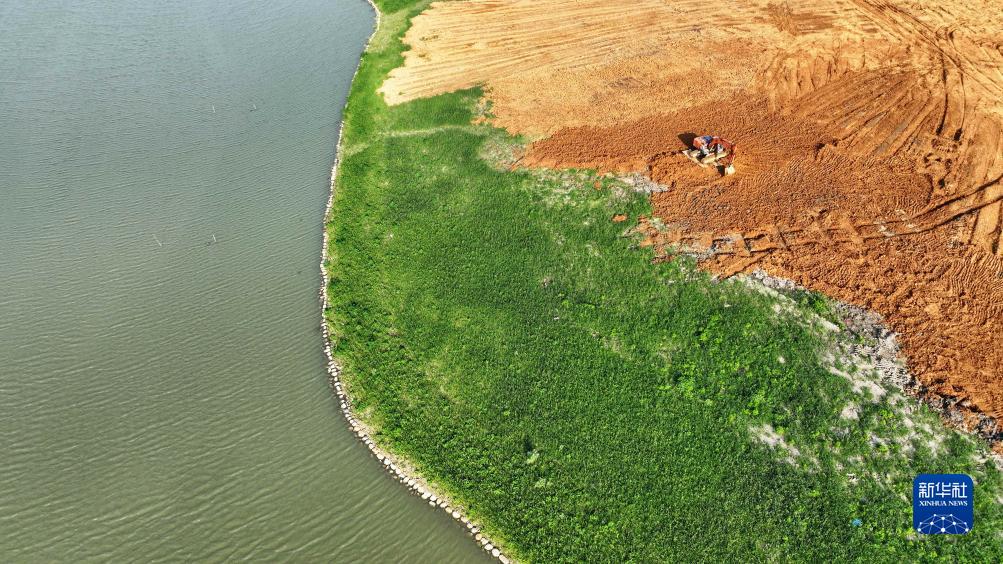 7月31日,在德清縣康乾街道金鵝湖濕地公園施工現場,挖掘機在進行土方開挖工程作業(無人機照片)。