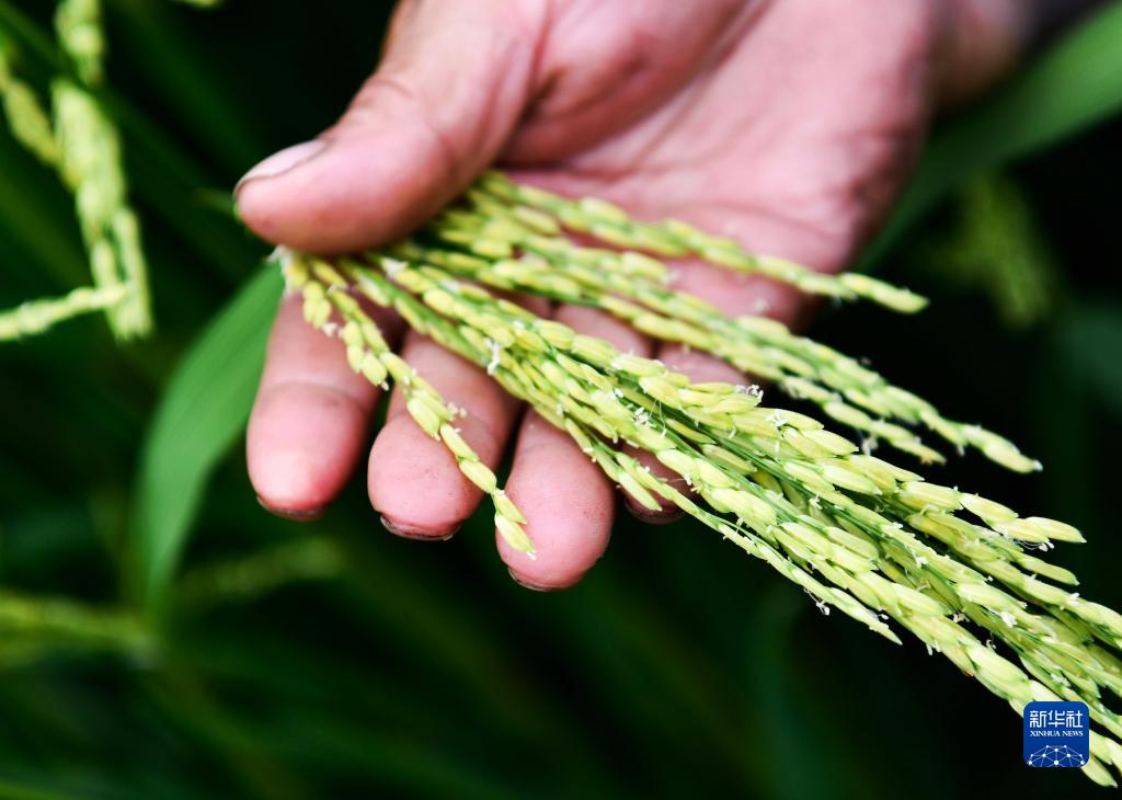 8月1日,農民在貴州省岑鞏縣水尾鎮新場村雜交水稻制種基地查看水稻授粉情況。