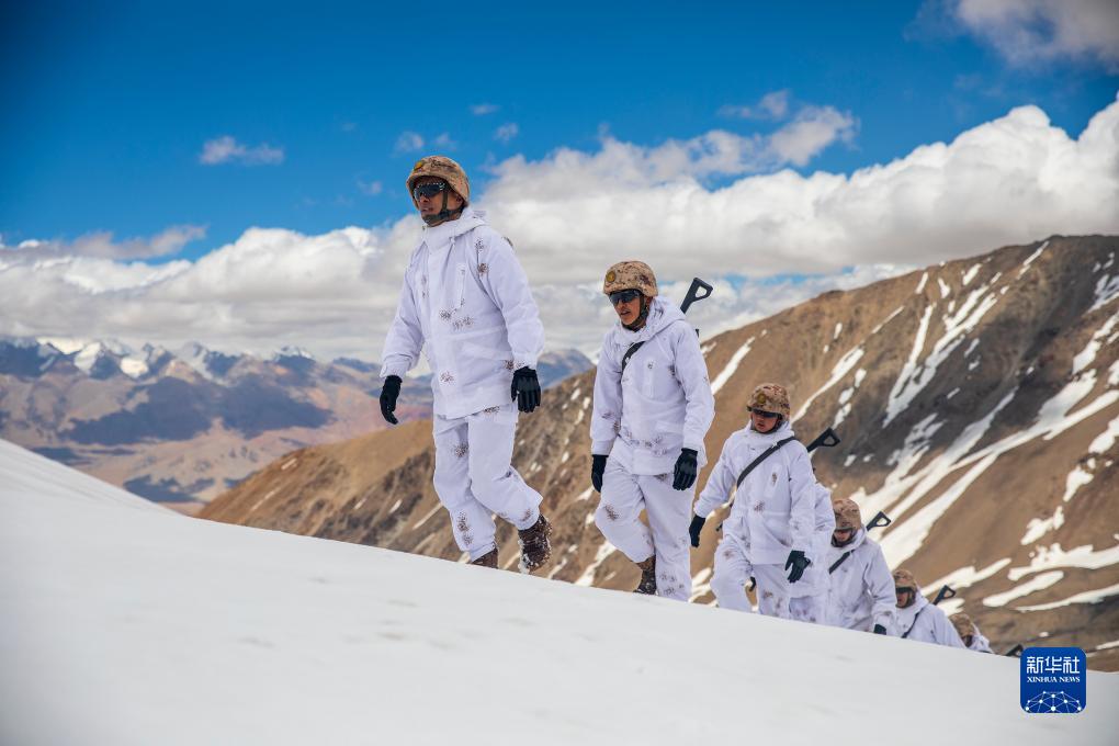 駐守在“生命禁區”的陸軍某邊防團官兵踏雪向點位前行(7月31日攝)。