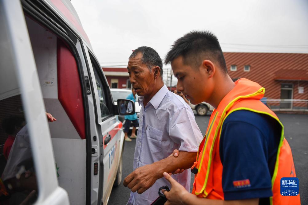 8月1日,在北京市門頭溝區妙峰山鎮妙峰山民族學校臨時安置點,門頭溝區消防救援支隊的消防員攙扶一名傷者登上救護車。