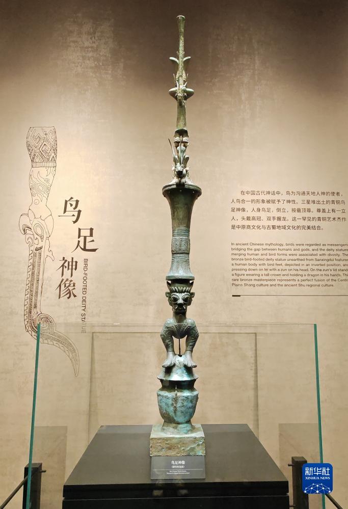 在新落成的三星堆博物館內,有這樣一件文物,融合了三星堆文明、夏商文明的典型特徵,也兼具了良渚、仰韶、石家河等文明的印記,它就是青銅鳥足神像。