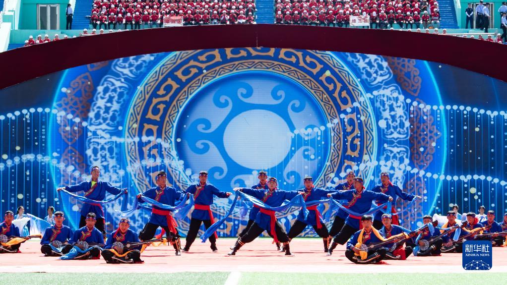 8月1日,當地群眾在海南藏族自治州成立70周年慶祝大會上表演節目。